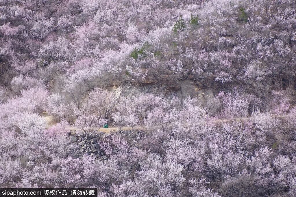 山桃花沿河岸、山坡肆意绽放