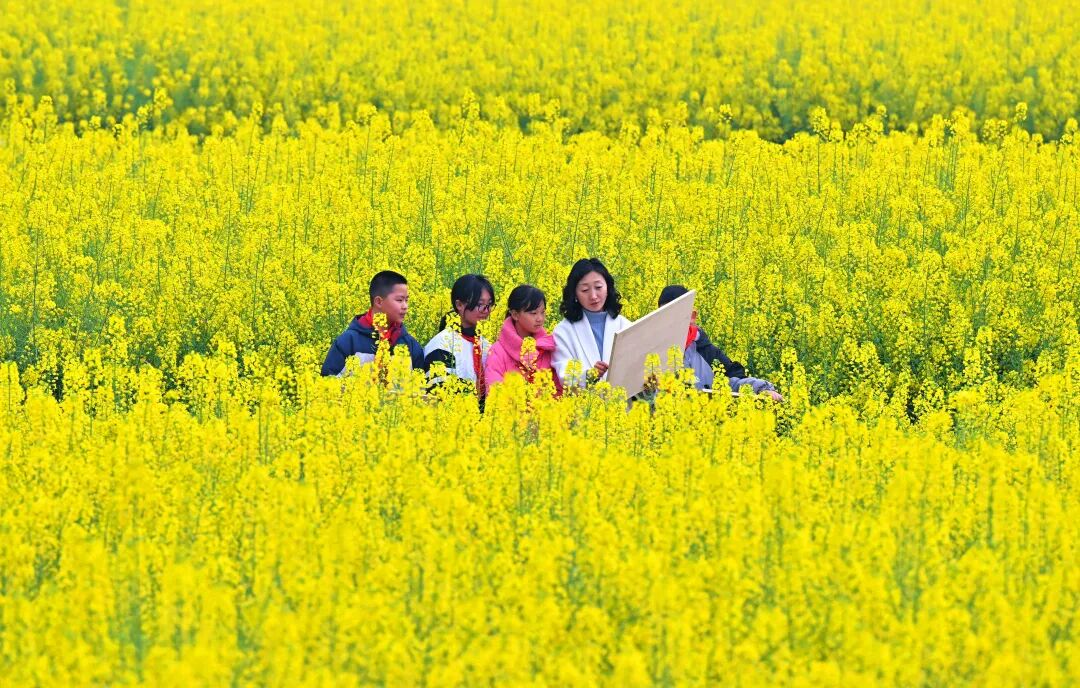 3月2日,学生在四川省眉山市仁寿县珠嘉镇油菜花田写生。潘建勇 摄(新华社发)