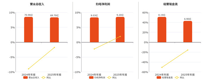 公司营业总收入为69.70亿元,较去年同报告期营业总收入减少1.26亿元,同比较去年同期下降1.78%。归母净利润为9.20亿元。经营活动现金净流入为6.90亿元,较去年同报告期经营活动现金净流入减少1.29亿元,同比较去年同期下降15.78%。